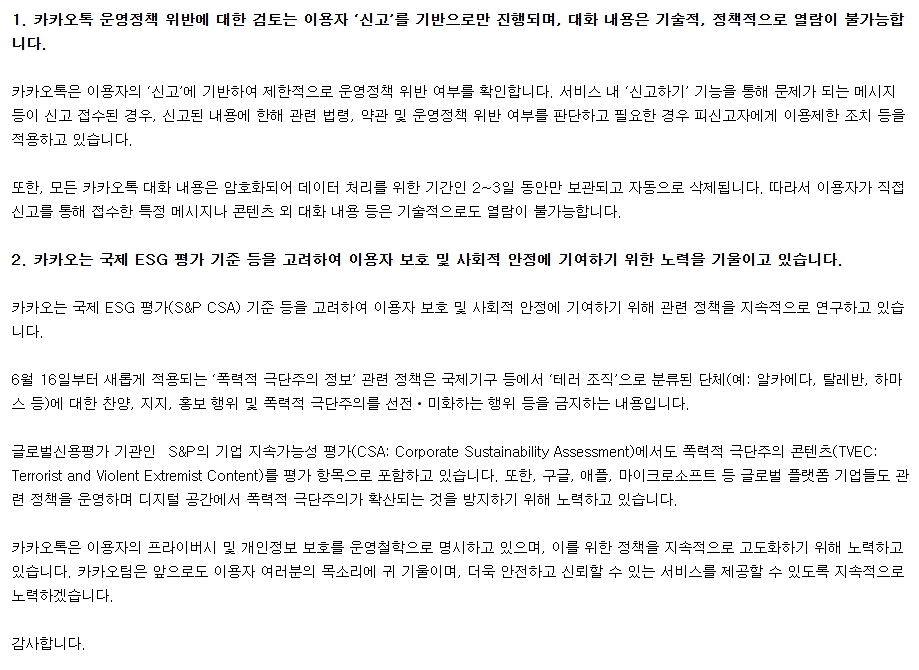 즉, 앞에서 말한데로 대화 검열이 있는게 아니라 구글과 같은 기업들이 하는 정책과 동일하게